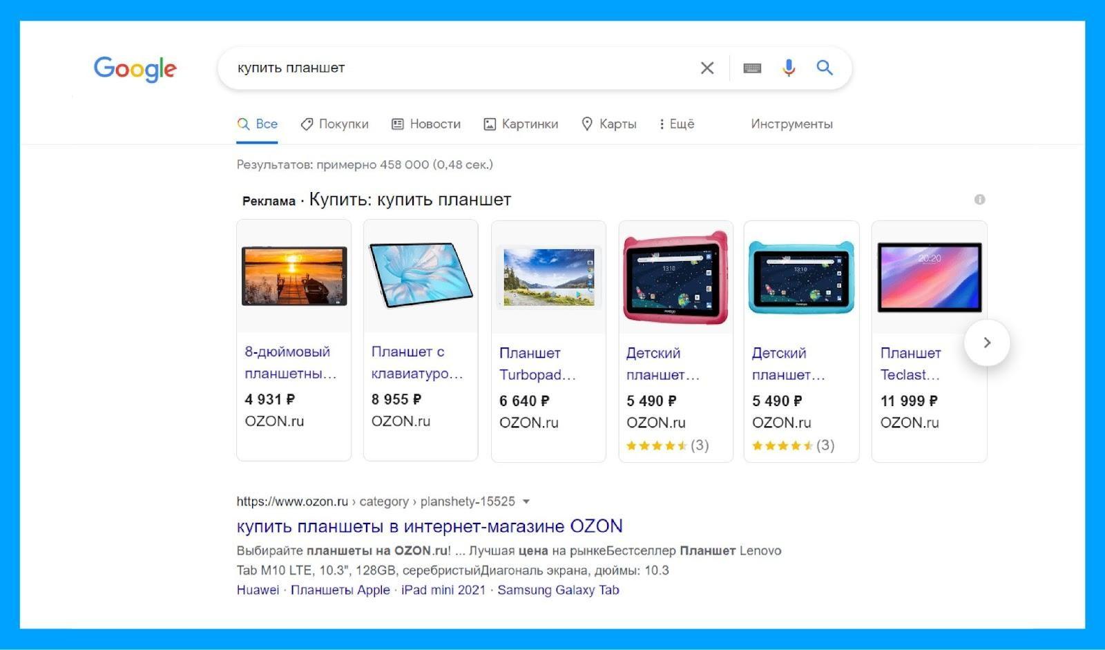 В то же время Ozon добавил в свой интерфейс возможностьпользоваться рекламными инструментами Google, рассказала компания. Продвижениетоваров будет осуществляться в блоке «Реклама» на странице результатов поискаGoogle, в сервисе «Покупки», в поиске по картинкам, на сервисах YouTube, Gmailи сайтах программы Google Search Partner.