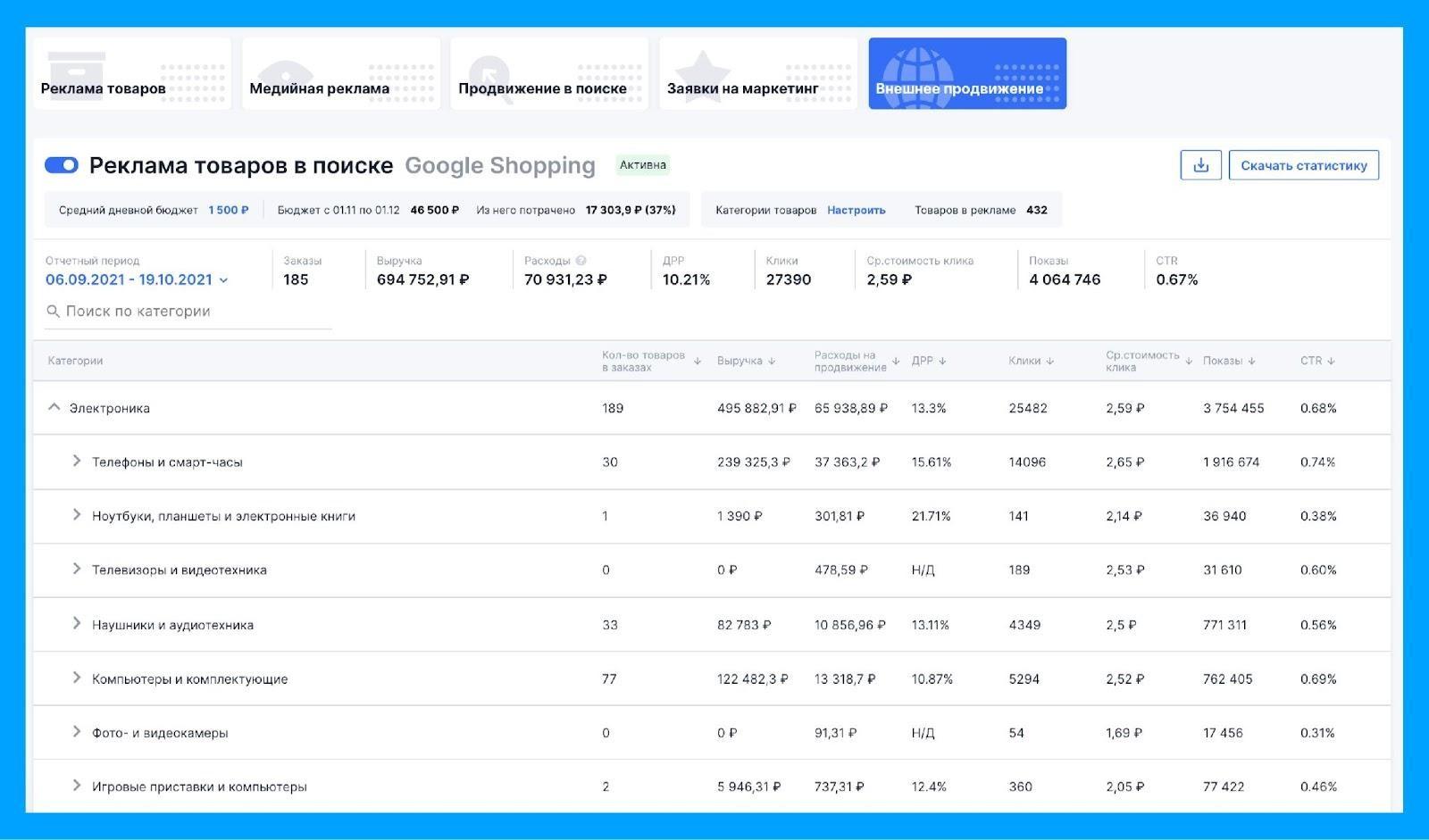 Возможность закупать внешний трафик и управлять рекламными кампаниямиреализована в личном кабинете продавца. Отчет по кампаниям также доступен вличном кабинете: с его помощью можно оценить эффективность затрат на клики,показы или долю рекламных расходов, увидеть конверсию продаж.