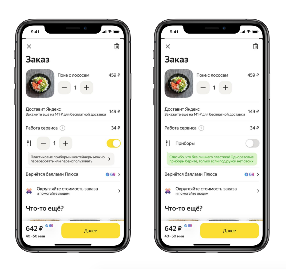 Сервис в январе уже тестировал доставку без пластиковых приборов поумолчанию. В итоге за месяц количество заказов без вилок, ложек и палочеквыросло на 20,2 процентных пункта по сравнению с тем же периодом прошлого года.В течение января 60% доставок было сформировано без приборов по желаниюклиентов. «За 2022 г. “Еда” планирует довести в приложении и на сайте долюзаказов без приборов до 30% — это значит, что примерно 50 тонн пластика непопадет в окружающую среду», — отмечается в релизе.