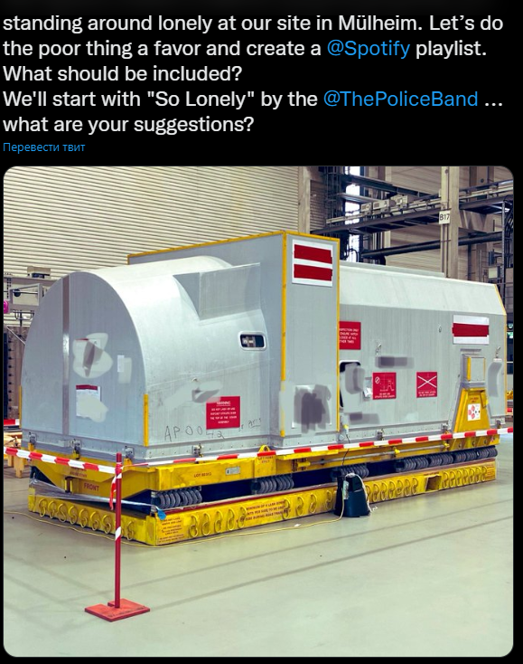 «Наша знаменитая турбина все еще не там, где она должна быть. Она стоит водиночестве на нашей площадке в (городе) Мюльхайм-на-Руре. Давайте окажембедняжке услугу и создадим плейлист в Spotify», — сообщается в Twitterкомпании.