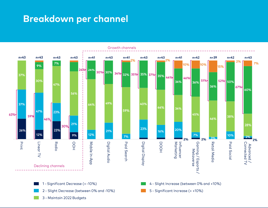 Также произойдет дальнейший переход от традиционных медиа к цифровым.Расходы 42% респондентов на цифровые технологии возрастут, а офлайн-СМИ —телевидение, радио, печать и наружная реклама — вероятно, пострадают. Почтиполовина респондентов планируют сократить офлайн-инвестиции, а четвертьпланирует значительно сократить расходы на печать.