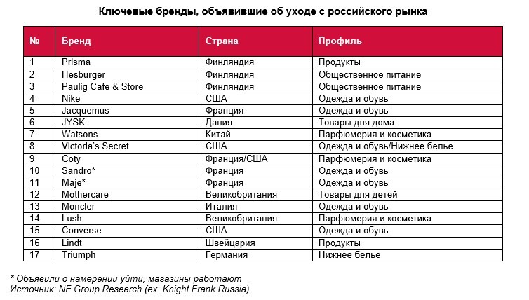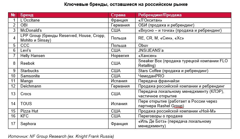 В список ключевых международных компаний, оставшихся в России, входят:L'Occitane — «Л'Окситан», OBI —«ОБИ», McDonald's — «Вкусно — и точка», брендыReserved, House, Cropp, Mohito и Sinsay компании LPP Group — RE, CR, M, «Син»,«Хс», CCC —Obuv и другие.