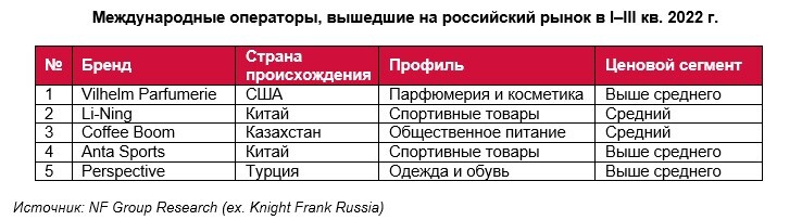 Новые бренды, которые открыли бизнес в России с первого по третийквартал 2022 года — Vilhelm Parfumerie (США), Li-Ning (Китай), Anta Sports(Китай), Perspective (Турция) и Coffee Boom (Казахстан).