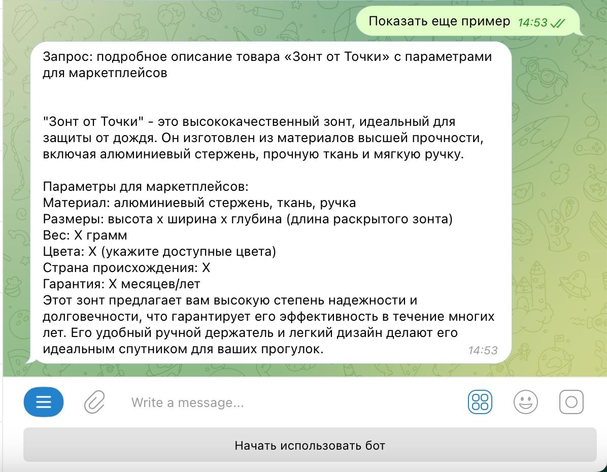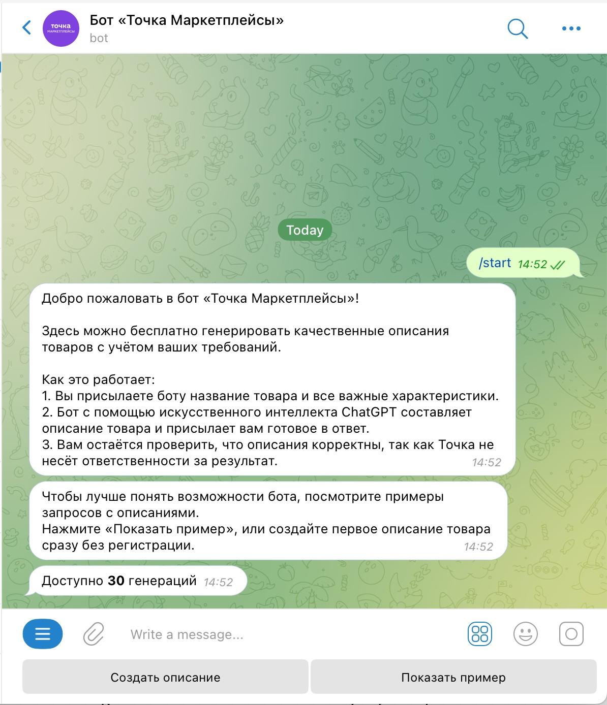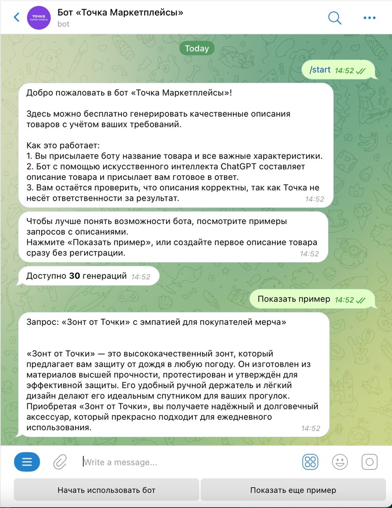 Особенность ChatGPT в том, что он работает с пользователем в режиме диалога.При этом бот «Точки» работает исключительно с запросами,связанными с описанием товаров. Темы, которые не касаются работы намаркетплейсах, бот обходит, предлагая составить карточку товара. На один и тотже запрос искусственный интеллект будет формировать разные ответы.