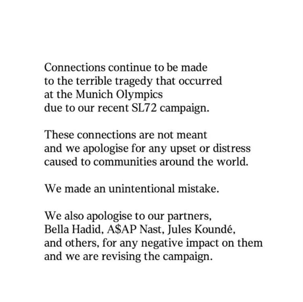 Позже семья модели сообщила о том, что столкнулась с большим количествомхейта. После этого бренд Adidas опубликовал официальные извинения. В компанииподчеркнули, что это были «ненамеренные связи с трагедией на Олимпийских играхв Мюнхене». Бренд в том числе извинился перед Беллой Хадид, A$AP Nast, ЖюлемКунде и другими — за «любое негативное влияние».