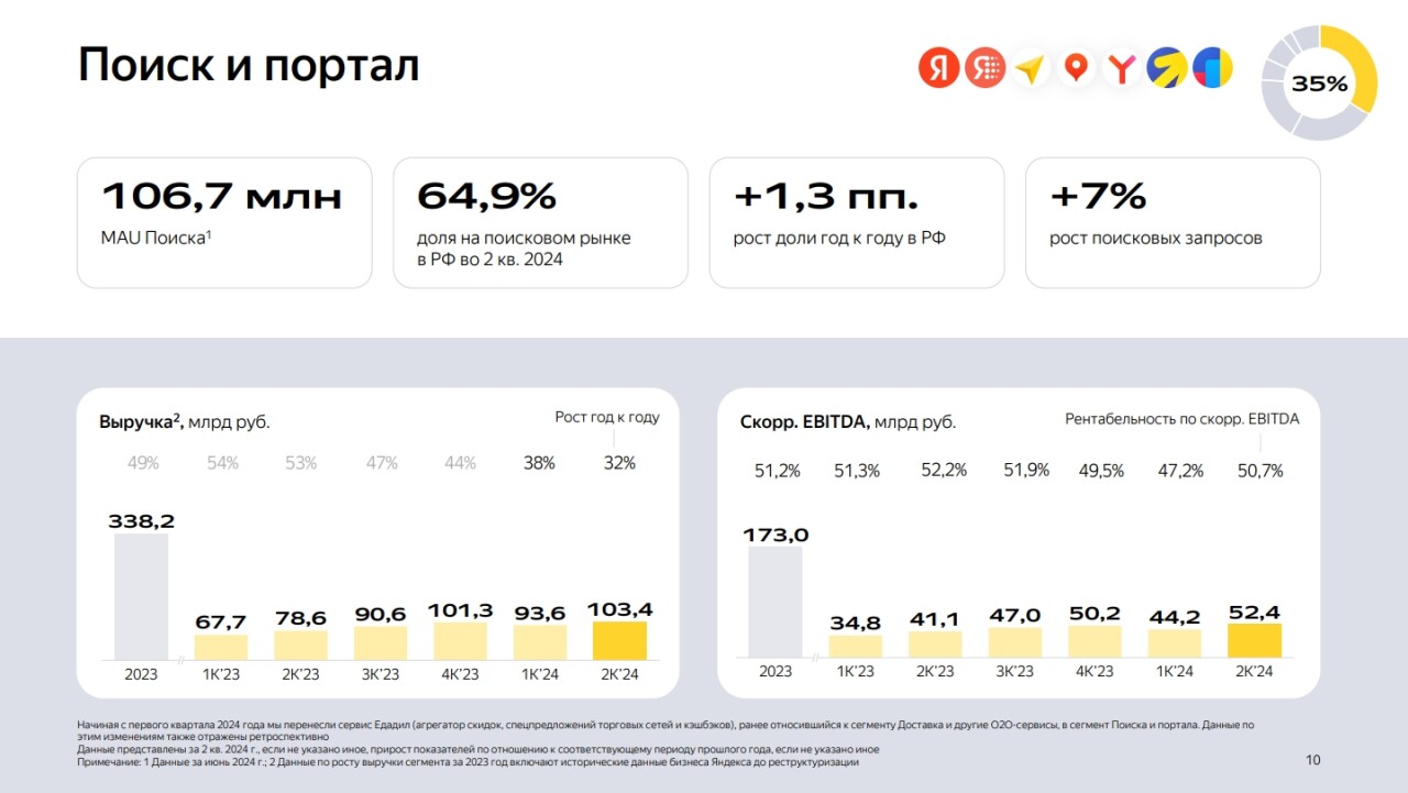Рентабельность скорректированного показателя EBITDA сегмента «Поиск ипортал» во втором квартале 2024 г. составила 50,7 против 52,2% год назад.Динамика связана с ростом расходов на персонал на фоне развития продуктов длямалого и среднего бизнеса и усиления направления электронной коммерции, а такжеинвестициями в генеративные нейросети.