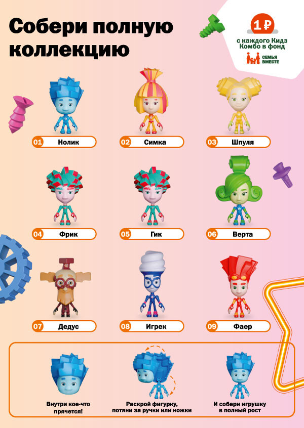 В линейку вошли девять фигурок с героями мультсериала: Нолик, Симка, Шпуля,Дедус, близнецы Фрик и Гик, Верта, Игрек и Файер. Фигурки можно сложить илисобрать в полный рост. Игрушку можно купить в комплекте «Кидз Комбо» илиотдельно.