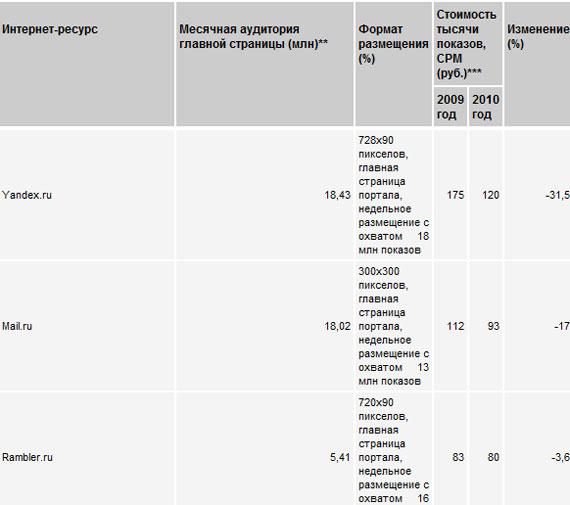 Размещать медийную (баннерную) рекламу на самых популярных порталах рунета в 2010 году станет дешевле. В обновленном прайс-листе 'Яндекса' показатель CPM (стоимость тысячи показов) по многим позициям снизился на 25-30%. Mail.ru уменьшил расценки для главной страницы, а Rambler придерживается прошлогодних цен. В компаниях надеются, что рекламодатели не сократят издержки, а будут закупать за те же деньги большее количество контактов с аудиторией.