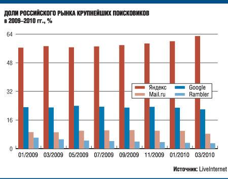 С начала прошлого года доля Rambler снизислась с 6,1 до 3%. «Доля поиска «Рамблера» падала в течение достаточно длительного времени из-за недостатка инвестиций в развитие сервиса. Падение в 2009-м — начале 2010-го имеет инерционный характер. Сейчас поиск для нас — один из ключевых фокусов, мы развиваем поисковые алгоритмы, вкладываемся в железо и специалистов», — говорит пресс-секретарь «Рамблер-Медиа» Марина Анисимова. «Яндекс» показал рост — его доля выросла на 6,5 п.п.