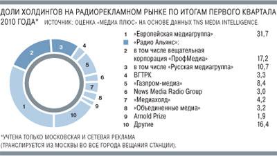 ООО 'Радио Альянс' было создано в конце 2009 года, а с 11 января начало продавать рекламу на всех радиостанциях партнеров, а также на Love Radio и станциях холдинга 'Медиа Холд' (радио 'Дача' и Xfm). Президент 'ПрофМедиа' Рафаэль Акопов в интервью 'Ъ' сравнивал создание 'Альянса' с появлением структуры, 'подобной 'Видео Интернешнл' на ТВ'. Объединенная компания должна была стать лидирующей на рынке, модернизировать систему измерений аудитории и увеличить долю радио в общем рекламном рынке (204,2 млрд руб. в 2009 году, по данным Ассоциации коммуникационных агентств России), с 5 до 7-8%. А в случае удачного сотрудничества господин Акопов не исключал и интереса 'ПрофМедиа' к покупке станций РМГ. Но за время существования 'Радио Альянс' не смог укрепить позиции партнеров. По данным 'Медиа плюс', в первом квартале 2010 года доля 'Альянса' составила 27,9%, в том числе ВКПМ — 17,2%, РМГ — 10,7%. Причем ранее руководитель 'Медиа плюс' Мария Смирнова заявляла, что доля ВКПМ осталась примерно на прошлогоднем уровне, а РМГ — сократилась примерно с 15%.