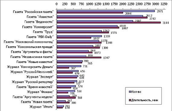 Так, по результатам исследований, во 2 кв. 2010 г. топ-20 изданий были упомянуты на радио и телевидении 22 083 раза, что составило по длительности цитирования 22 084 минуты. За этот период большинство изданий продемонстрировало увеличение количества упоминаний и показателя длительности цитирования.