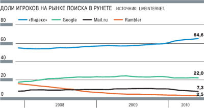 С нового года Яндекс прибавил 9,7% — и на июнь 2010 года контролировал 64,6% поиска, в то время как доли его основных конкурентов снижались. Больше всего пострадал портал Mail.ru, доля которого с декабря прошлого года сократилась на 27%, Rambler потерял 11,8% поиска, а Google — 6%