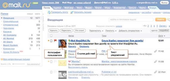 «Речь идет об аватаре человека, совершившего действие на сайте, смысловой части послания, а также прямых ссылках на конкретные действия (например, „подружиться“ или „подтвердить регистрацию“) прямо в списке писем, что позволяет мгновенно на них отреагировать»,— говорится в пресс-релизе.