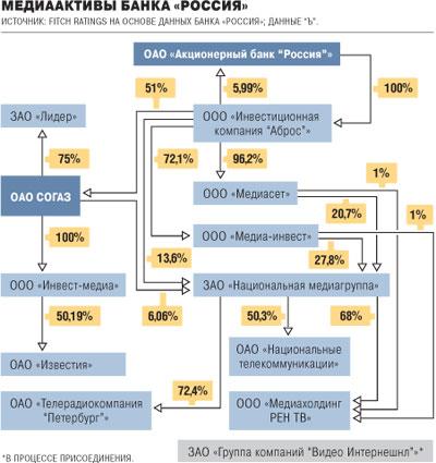 Позднее у нее эту долю приобрел 'Сургутнефтегаз', а в конце 2006 года она перешла структурам банка 'Россия' Юрия Ковальчука (при этом и 'Северсталь-групп', ныне 'Севергрупп', и 'Сургутнефтегаз' были и остаются одними из учредителей банка). Сейчас РЕН ТВ входит в НМГ, управляющую медиаактивами 'России'.