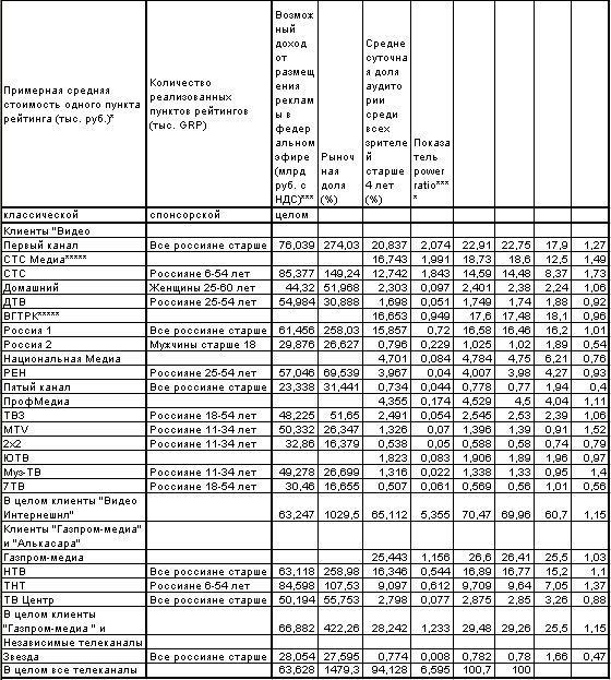 Наибольший доход в 2010 году от размещения федеральной рекламы из всех вещателей получил 'Первый канал', по подсчетам 'Квенди РусМедиаАудит', более 22,9 млрд руб. (см. таблицу). Крупнейшим же холдингом по рекламной выручке на ТВ является уже 'Газпром-медиа': совокупный доход НТВ и ТНТ оценен в 26,6 млрд руб. В 2008-2009 годах крупнейшим по сборам из отдельно взятых каналов также был 'Первый', а из холдингов 'Газпром-медиа'. Как объявляла ФАС, доля 'Первого' в сегменте федеральной рекламы за два года равнялась 22,01% (соответствует примерно 28,46 млрд руб. без НДС и комиссии продавца), 'Газпром-медиа' — 26,47% (34,22 млрд руб.).