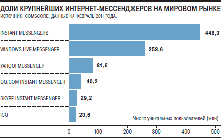 Как следует из последней отчетности Mail.ru Group, ежемесячная аудитория ICQ во всем мире с декабря 2009 года по декабрь 2010 года снизилась с 51,1 млн за до 33,5 млн человек. В России за этот же период аудитория 'аськи' сократилась с 18 млн до 16,4 млн пользователей. В ближайшие годы долю будут терять все мессенджеры, не интегрированные в социальные сети, уверен эксперт ИК 'Финам' Леонид Делицын. 'Пользователи все чаще пользуются встроенными мессенджерами социальных сетей. Расцвет популярности отдельных сервисов мгновенных сообщений закончился, ICQ надеется максимально монетизировать продукт, пока это возможно',— считает он.