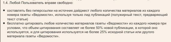 Вообще, это не единственные правила использования 'Ведомостей' на сайте издания, другой их вариант намного более либерален, например:
