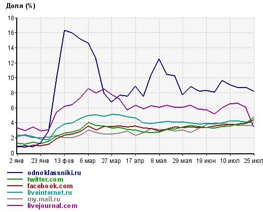 Если пользователи 'Одноклассников', соцсеть Li.ru и My.mail.ru практически не поменяли число переходов на сайты Рунета, то 'Живой Журнал' недораздал почти треть трафика, а с Twitter и Facebook перешло пользователей на четверть больше по сравнению с обычными значениями. Вероятнее всего в этих трех соцсетях (ЖЖ, Twitter и Facebook) и сосредоточены российские юзеры-гики соцсетей.