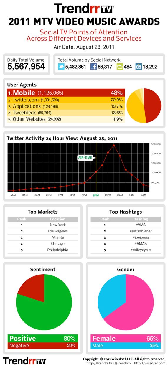 Наглядно это показывает инфографика Trendrr, где собраны данные об онлайн-популярности церемонии вручения телевизионных наград. Только в воскресенье в социальных сетях было зафиксировано 5,5 миллионов упоминаний VMA 2011. Большая часть при этом приходится на twitter.