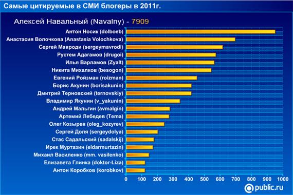 Как и в прошлогоднем рейтинге Интернет-библиотеки СМИ Public.Ru первое место в 2011 году по-прежнему принадлежит непримиримому борцу с коррупцией Алексею Навальному (Navalny) – около 8 000 упоминаний в СМИ.