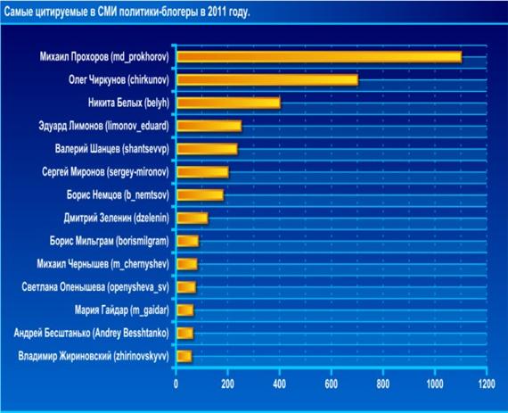 В ТОП-20 самых цитируемых в СМИ блогеров в 2011 году вошли также Илья Варламов, Никита Михалков, Евгений Ройзман, Борис Акунин (предложивший план освобождения Ходорковского и придумавший новый термин «ампутинация») и Станислав Садальский - единственный, имеющий в СМИ почетное звание «народный блогер».