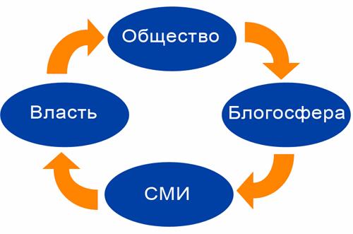 Возникшая в последние годы новая информационная вертикаль - «общество-блогосфера-СМИ-власть» укрепилась, и начался процесс замыкания в кольцо. Все свободней начинают циркулировать информационные потоки от общества к властным структурам. Власть не только получает сигнал «снизу», на записи в блогах самых обычных людей реагируют самые высокопоставленные чиновники и сам президент страны. Не только реагируют, но и привлекают к совместной деятельности.