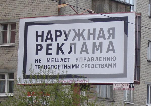 На улицах Екатеринбурга появились билборды, защищающие наружную рекламу. В городе сложилась неблагоприятная для отрасли ситуация – по мнению городской администрации, из 10 тысяч рекламных поверхностей законны лишь 4,6 тысяч. Кроме того, у подавляющего большинства владельцев рекламных мест срок аренды истекает в конце этого или в июле следующего года