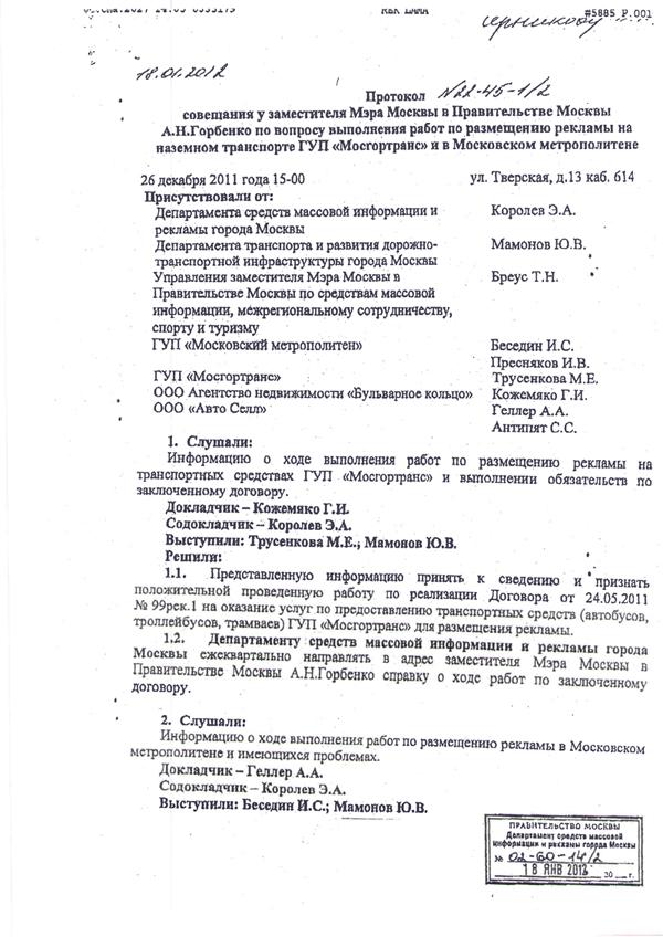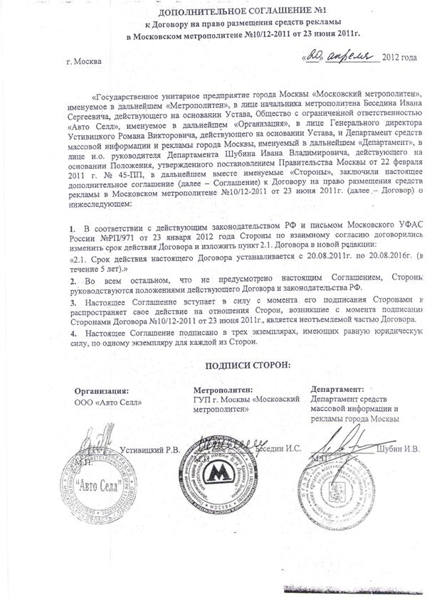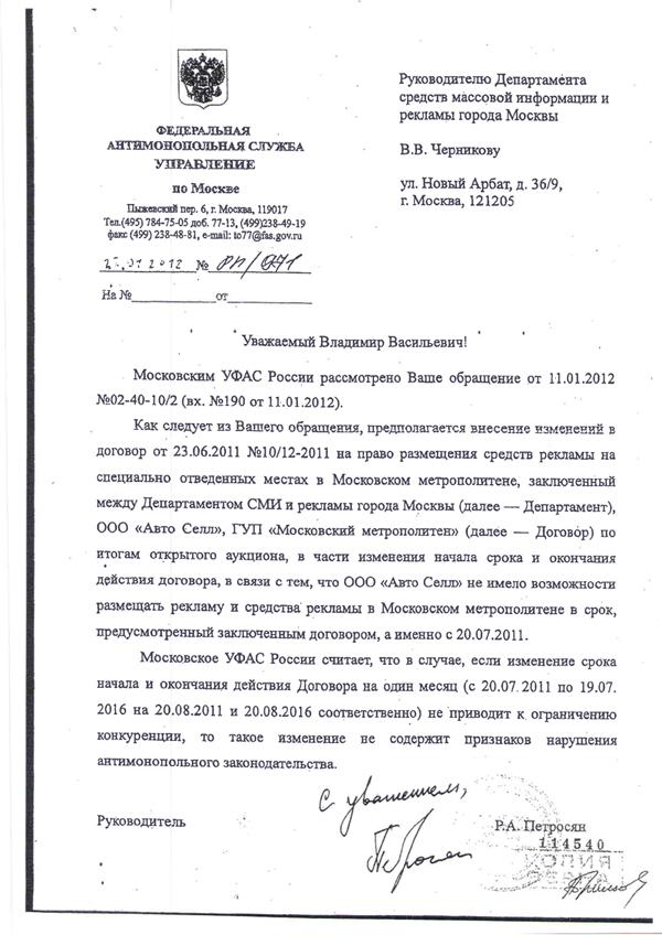 Уже 25 января 2012 года из Федеральной антимонопольной службы пришло письмо на имя руководителя столичного департамента СМИ и рекламы Владимира Черникова, в котором говорилось о том, что Московское УФАС не имеет ничего против изменения сроков действия договора, если «такое изменение не содержит признаков нарушения антимонопольного законодательства». 20 апреля 2012 года, как раз в начале второго квартала было подписано дополнительное соглашение №1 к договору об изменениях сроков. Получается, что договор с 'Авто Селл' вступил в силу с июля 2011 года, а после пересмотра его действие сдвинули на месяц вперед. Теперь срок действия договора - с 20.08.2011 до 20.08.2016. То есть, «Авто Селл» получила месяц бесплатного пользования рекламными площадями. А если «Авто Селл» платил за квартал 600 млн, то получается, что передвинув срок действия договора с июля на август, компании удалось сэкономить более 198 миллионов рублей.
