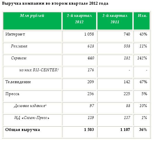 Компания опубликовала финансовые результаты за второй квартал и первое полугодие 2012 года. Совокупная выручка «РБК» во втором квартале увеличилась на 36% по сравнению с аналогичным периодом 2011 года и составила 1,5 миллиарда рублей