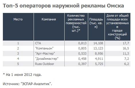 В Сибири и на Урале формируется свой лидер в наружной рекламе. Новосибирский оператор 'Дизайнмастер', уже занимающий по количеству рекламных поверхностей пятое место в России, объединился с также расположенным в Новосибирске 'Артбизнеслайном'. Кроме этого, компания могла получить рекламные поверхности омского оператора 'Арт-Мастер'.