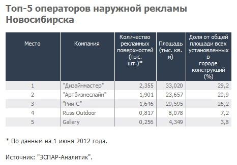 'Дизайнмастер' располагает в Новосибирске, по данным исследовательской компании 'ЭСПАР-Аналитик', более 2,3 тыс. рекламных поверхностей общей площадью 33 тыс. кв. м. У 'Артбизнеслайна' — 1,9 тыс. поверхностей площадью почти 23,7 тыс. кв. м. Доля объединенной компании, если ориентироваться на цифры 'ЭСПАР-Аналитик', превышает 50% от суммарной площади всех установленных в городе конструкций.