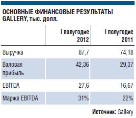 Валовая прибыль компании выросла в полтора раза и составляет 42,4 млн долл. Рост выручки Gallery в первом полугодии 2012 года в первую очередь обусловлен расширением собственной сети рекламных поверхностей, число которых достигло более 37 тыс. штук, а также ростом объема выручки от медиабаинга. В компании отмечают, что наибольшее число продаж приходится на продажу рекламных щитов формата 6 х 3 (доля в общей структуре продаж 42%) и уличного инвентаря, в том числе указателей (21% в выручке). В первом полугодии 2012 года были открыты представительства в Астрахани и Тамбове. Всего на конец отчетного периода сеть Gallery включает в себя 27 представительств в России и два представительства в Украине. «Активные продажи рекламы, внедрение новых форматов, соответствующих законодательным требованиям регионов и расширение сети принесли позитивные результаты. Перенос основного количества тендеров на рекламные конструкции по Москве на весну 2013 года дает больше возможностей для подготовки и увеличивает текущую ликвидность Gallery. Компания продолжает придерживаться стратегии органического роста как в России, так и на Украине», — заявил Дмитрий Зайцев, генеральный директор Gallery .