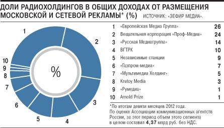 Разговоры о возможной продаже радиохолдинга Игоря Крутого идут уже несколько лет: так, еще осенью 2008 года крупнейшие участники рынка получили предложение исходя из оценки всех трех станций в $50-60 млн, но покупателей тогда не нашлось. Похожая оценка может быть актуальна для продавца и сейчас, предполагает глава одного из радиохолдингов, вспоминая, что некоторое время назад только Love Radio его владелец оценивал не менее чем в $20-25 млн. Сопоставимые деньги может стоить и 'Радио Дача', значительно меньше — 'Такси FM'. Доля Krutoy Media в сегменте московской и сетевой (когда ролик транслируется во всех городах вещания сети) радиорекламы по итогам девяти месяцев составила, по оценке сейлз-хауса 'Зефир Медиа', 3% при общем объеме 4,37 млрд руб. без НДС. То есть три радиостанции Игоря Крутого могли заработать на такой рекламе около 131 млн руб. ($4,2 млн).