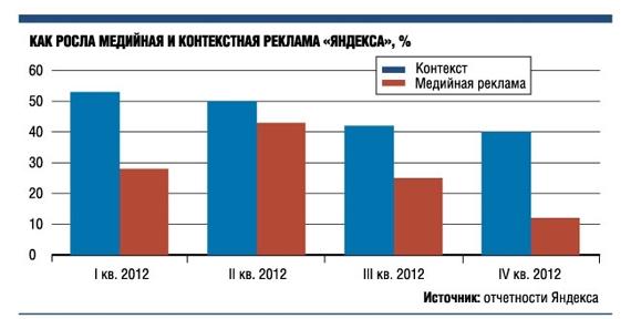 Выручка от медийной рекламы увеличивается медленнее, чем от контекста. На баннерах «Яндекс» в 2012 году смог заработать 2,59 млрд руб., что на 24% больше, чем в 2011 году. При этом доходы интернет-компании в этом сегменте также росли быстрее рынка, который, по подсчетам АКАР, достиг 17,9 млрд руб. (+17%).