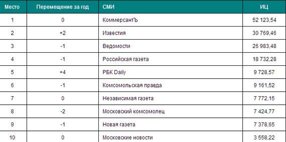 «КоммерсантЪ» удержал свое лидерство в рейтинге федеральныхгазет. Затем следуют «Известия» с наиболее цитируемыми материалами -предвыборная статья Владимира Путина и резонансные интервью Дмитрия Рогозина иВладимира Поповкина. На третьем и четвертом местах соответственно – «Ведомости»и Российская газета». На пятой позиции «РБК Daily» - оттуда цитировались, вчастности, материалы о закупках МВД машин «для отдыха» и о предложении РЖДпередвинуть российско-украинскую границу.