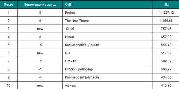 Первые две позиции за прошлый год не изменились – тамнаходятся Forbes и The New Times. В рейтинг впервые попали журнал «Сноб»(учредил премию «Сделано в России»), GQ с рейтингом самых невлиятельных мужчини «Афиша» с интервью Дмитрия Пескова. Самое заметное перемещение (на пятьпунктов вверх) у журнала «КоммерсантЪ-Деньги», опубликовавшего рейтинг самыхквалифицированных управляющих компаний.