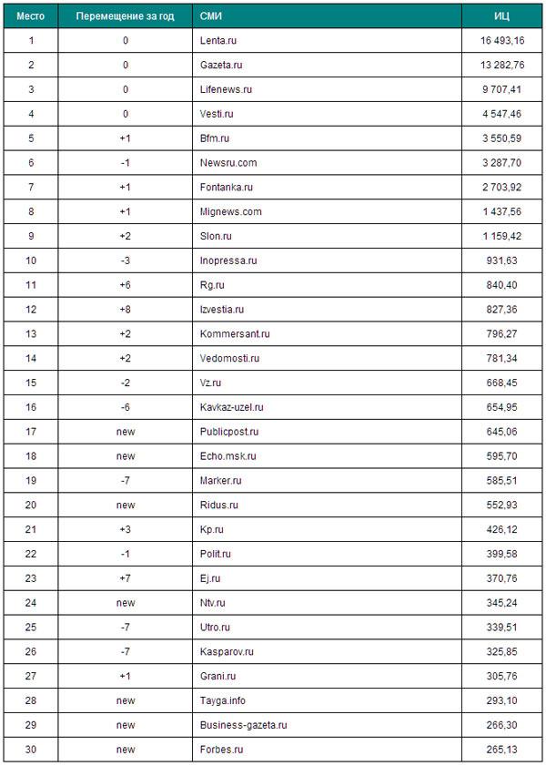 Из рейтинга Интернет-ресурсов исключены сайтыинформационных агентств. Одноименные кириллические названияинформационных агентств не позволяют точно определить первоисточник, на который ссылаются СМИ.