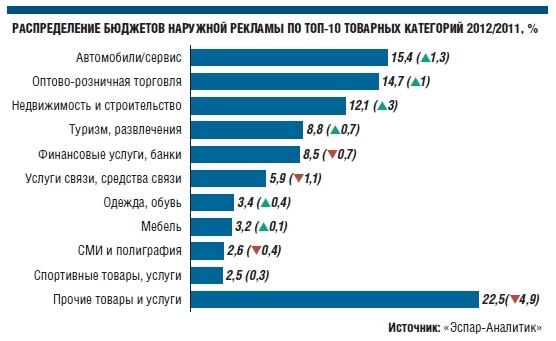 Топ-10 рекламодателей в 2012 году потратили на размещение порядка 4,7 млрд руб. (9,9% всех рекламных расходов), следует из отчета аналитического центра Russ Outdoor. Чаще всего на щитах и билбордах появлялись автомобильные дилеры и сервисные службы, вложив в свое продвижение 7,3 млрд руб. (15,4%). Ритейлеры оставили чуть меньше — 6,9 млрд руб. (14,7%).