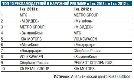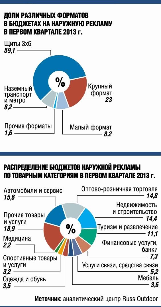 Оборот рынка наружной рекламы в России в первом квартале 2013 года, по данным Russ Outdoor, увеличился на 7% и достиг 11 млрд руб. (без учета НДС, но с затратами на печать)