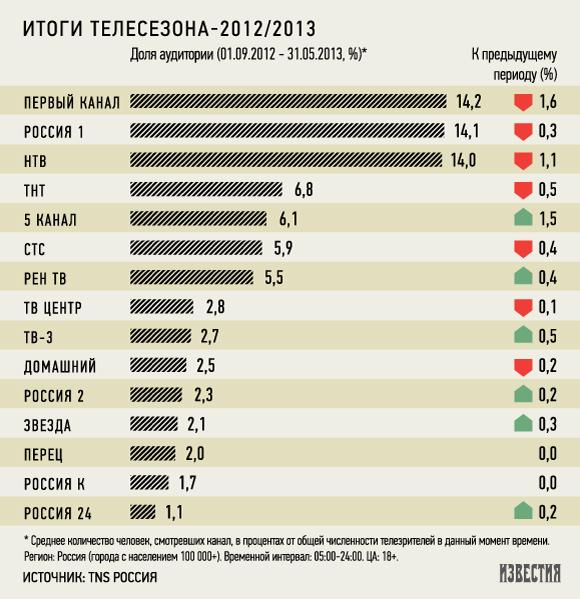 За развлекательными программами взрослые российские телезрители предпочитают ходить на «Первый канал», а за телесериалами — на НТВ, следует из данных «TNS Россия» по телесезону-2012/13 (исследование проводилось в городах с населением более 100 тыс., среди жителей в возрасте от 18 лет за период с 1 сентября 2012 года по 31 мая 2013-го в сравнении с периодом 1 сентября 2011 года по 31 мая 2012-го).