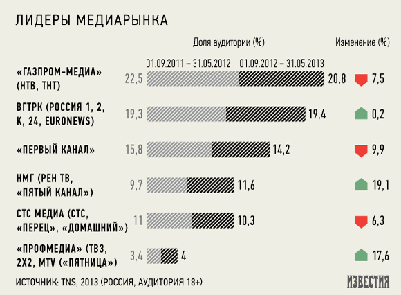 В завершившемся телесезоне (сентябрь 2012 года — май 2013 года) три четверти российских телезрителей старше 18 лет смотрели каналы, входящие в шесть медиахолдингов страны. Это «Газпром-Медиа» (НТВ, ТНТ), ВГТРК («Россия 1», «Россия 2», «Культура», «Россия 24», Euronews), «Первый канал», НМГ (РЕН ТВ, «Пятый канал»), «СТС Медиа» (СТС, «Перец», «Домашний») и «ПрофМедиа» (ТВ-3, 2х2, MTV).