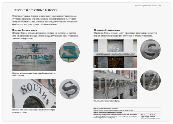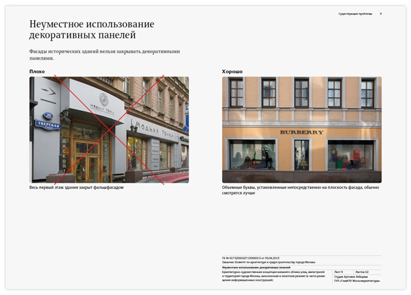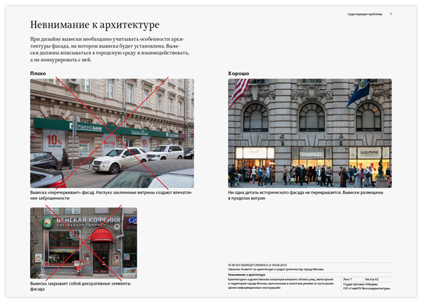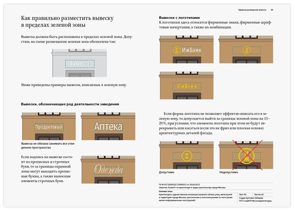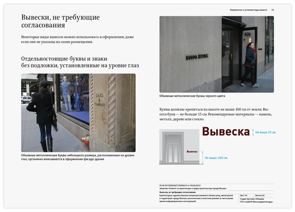 Кроме общих рекомендаций по оформлению и установке на фасадах разнообразных конструкций, в руководство включены варианты гармоничного размещения вывесок для всех зданий на улицах Большая Дмитровка, Петровка, Кузнецкий Мост, Рождественка, Тверская, 1-я Тверская-Ямская, Большая Садовая, Воздвиженка, Новый Арбат, а также в Столешниковом и Камергерском переулках.