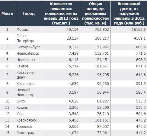 Та же ситуация сложилась и в Петербурге — втором по величине рынке. В 2012 году его объем 'ЭСПАР-Аналитик' оценивает в 4,169 млрд руб., или более 12% всех затрат на наружку. Как сообщили 'Ъ' в комитете по печати и взаимодействию со СМИ Петербурга, на 1 июля 2008 года в городе было установлено 13 883 конструкции общей площадью 246,8 тыс. кв. м, к 1 июля 2013 года сроки истекли уже у 13 848 конструкций. Актуальна проблема и для Краснодара: к 1 июля закончились контракты на 5530 конструкций (из 5550, действовавших на 1 января). Доходы операторов в 2012 году в 'ЭСПАР-Аналитик' оценили в 591,5 млн руб. (1,7% всего рынка РФ).