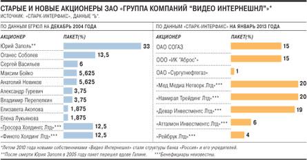 Сергей Васильев возглавил 'Видео Интернешнл' в 2003 году. На декабрь 2004-го, как свидетельствует имеющаяся у 'Ъ' выписка из ЕГРЮЛ, господину Васильеву принадлежали 6% головного ЗАО 'Группа компаний 'Видео Интернешнл''. Большие доли были только у президента ВИ Юрия Заполя (33%, после его смерти в 2005 году пакет перешел к его вдове Галине) и заместителя гендиректора группы, курировавшего ее международный бизнес, Оганеса Соболева (13,5%). Еще по 12,5% тогда числились за кипрскими 'Гросора Холдингс Лтд' и 'Финото Холдинг Лтд', чьи бенефициары неизвестны.