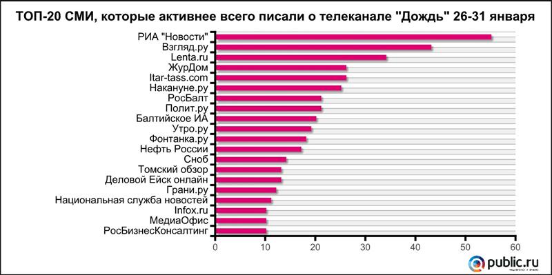Больше других о скандале вокруг телеканала «Дождь» (признан в России иноагентом) писали «РИА Новости», «Взгляд.ру» и Lenta.ru