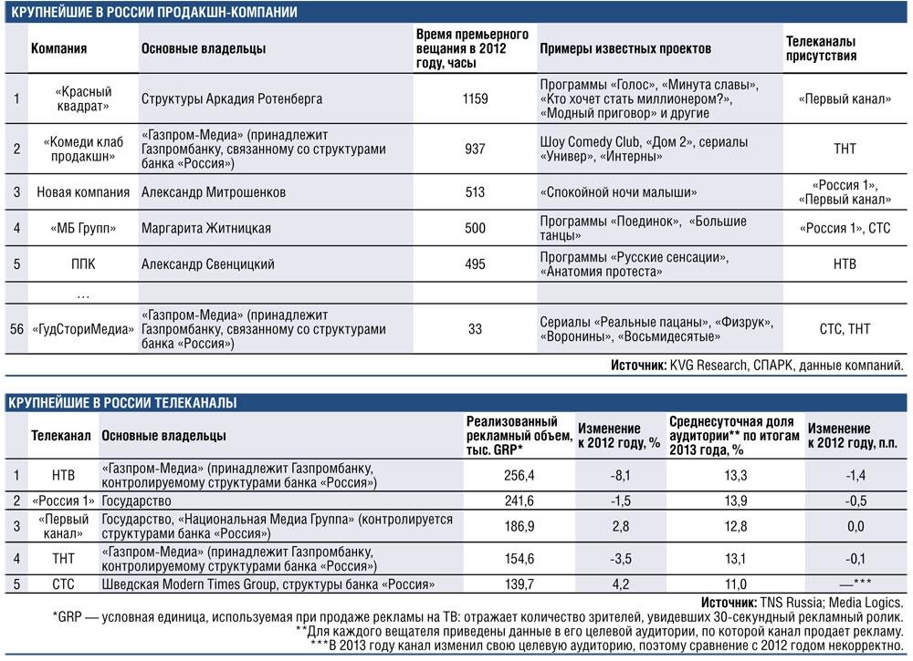 Покупка «Гудсторимедиа» — уже третья сделка на рынке производителей телеконтента за этот год. В марте Национальная медиа группа, подконтрольная банку «Россия» Юрия Ковальчука, объявила о покупке 50% Art Pictures Vision, входящей в группу Art Pictures Федора Бондарчука и Дмитрия Рудовского. Эта компания была создана только в 2012 году и известна прежде всего как производитель сериала «Молодежка» для СТС (структуры банка «Россия», в том числе и сама Национальная медиа группа, являются бенефициарами «СТС Медиа»). За Art Pictures Vision также было заплачено около 50 млн долл., рассказывали источники РБК. А в прошлом месяце было объявлено о том, что Аркадий Ротенберг договорился о покупке 51% группы «Красный квадрат», основного производителя контента для «Первого канала» (программы «Голос», «Кто хочет стать миллионером», «Минута славы», «Модный приговор»). Продавцом была названа Лариса Синельщикова, президент «Красного квадрата» и бывшая подруга гендиректора «Первого канала» Константина Эрнста. Реальная оценка бизнеса «Красного квадрата» неизвестна, поскольку непонятно, на каких условиях его владелица решила отказаться от контроля над группой и какие последствия сделка будет иметь для «Первого канала» и его гендиректора.