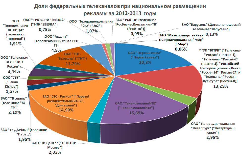ФАС России уточнила перечень федеральных телеканалов и рассчитала их доли при национальном и региональном размещении рекламы за 2012-2013 годы