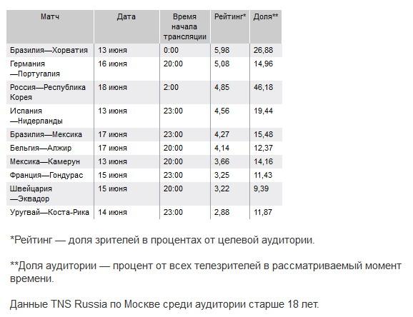 Стартовый матч сборной России на проходящем в Бразилии чемпионате мира по футболу оказался лишь третьим в Москве среди самых рейтинговых трансляций первого тура группового этапа мундиаля. Лидерами стали стартовая игра чемпионата Бразилия—Хорватия, а также Германия—Португалия. Дело в том, что, в отличие от этих игр, матч национальной сборной транслировался в Москве глубокой ночью