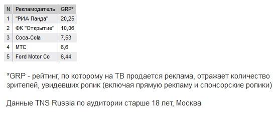 За прямым эфиром на 'Первом канале' наблюдала примерно половина всех телезрителей Москвы, находившихся в этот момент у телеэкранов (46,18%), это самый высокий показатель на старте турнира, следует из расчетов Havas Media, сделанных для 'Ъ'. Рекламу в прямой трансляции разместили 17 брендов (см. таблицу). Рейтинг трансляции составил 4,85%, охват — 6,82% населения Москвы старше 18 лет (данные TNS Russia).