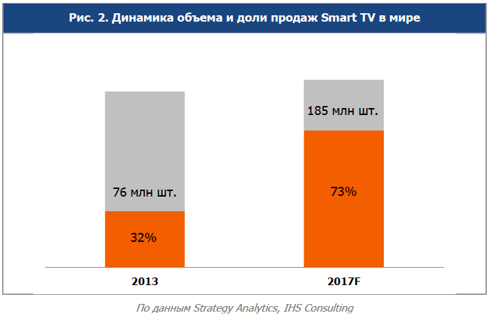 По прогнозам IHS Consulting, к 2017 году продажи телевизоров превысят 257 млн устройств, а количество проданных Smart TV составит 185 млн устройств. Таким образом, доля Smart TV в продажах ТВ возрастет с 32% до 73% (по прогнозам Strategy Analytics).
